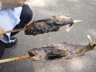 エレベーターで上に戻り近くで売ってたイワナを食う。